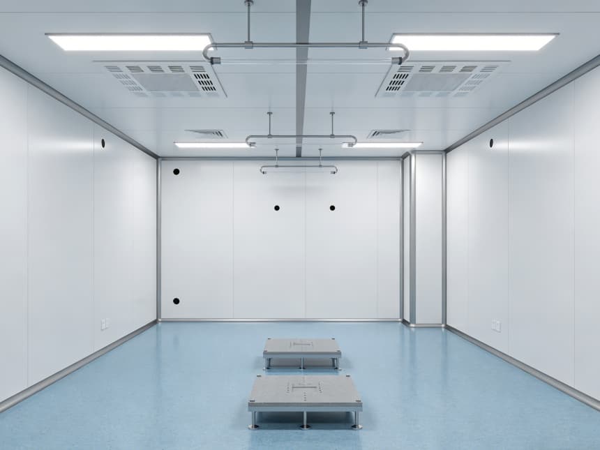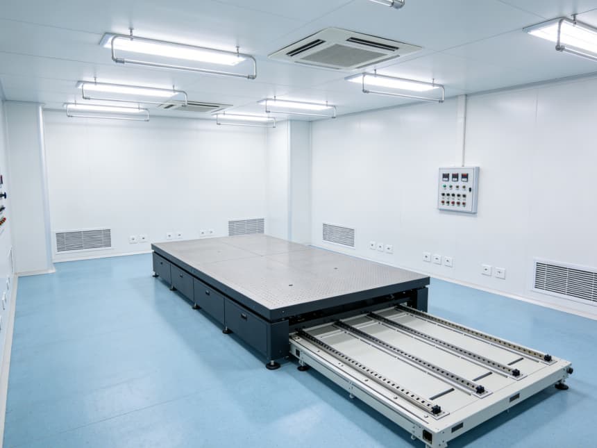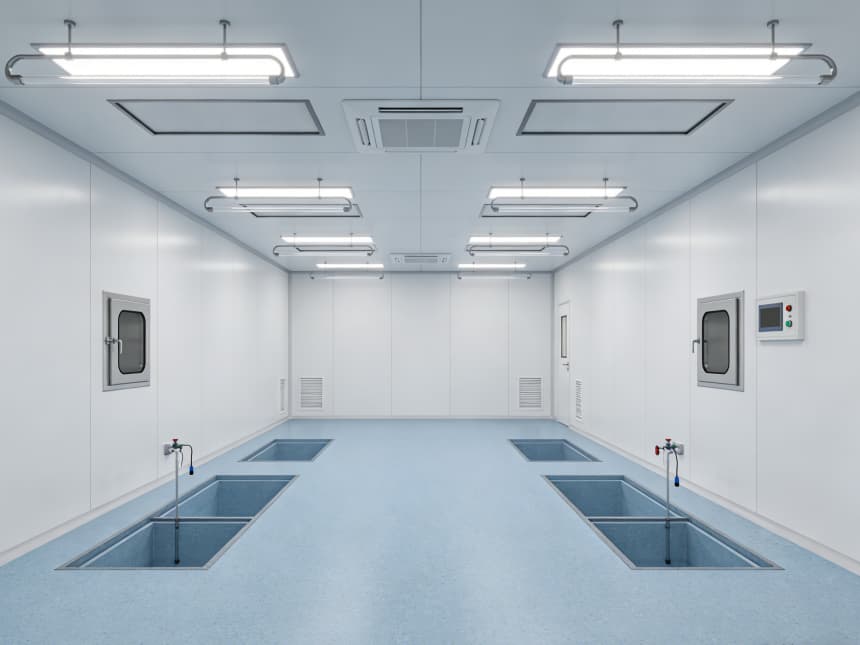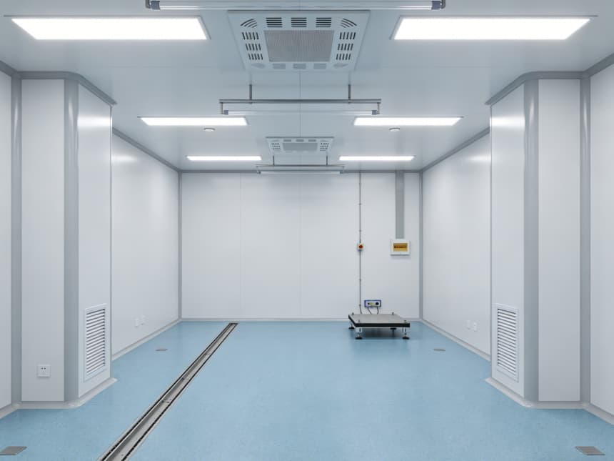 電子光學(xué)車間內(nèi)部細節(jié)設(shè)計精準(zhǔn)匹配行業(yè)核心需求,整體采用淺藍色防靜電潔凈地坪與白色無縫潔凈墻面的組合,風(fēng)格簡約統(tǒng)一。地面選用3mm厚環(huán)氧防靜電材質(zhì),表面經(jīng)啞光工藝處理,既能有效規(guī)避強光反射對光學(xué)檢測造成的干擾,又具備10?-10?Ω的穩(wěn)定防靜電性能;同時兼具優(yōu)異的耐磨特性,可耐受酒精等常用清潔劑擦拭,墻角均采用50mm圓弧設(shè)計,從根源上消除積塵死角,筑牢潔凈基礎(chǔ)。