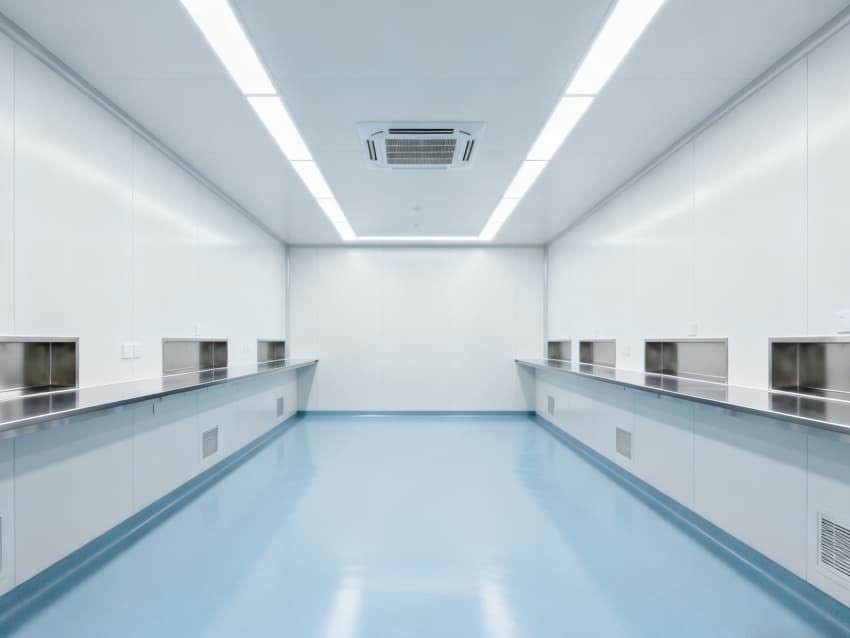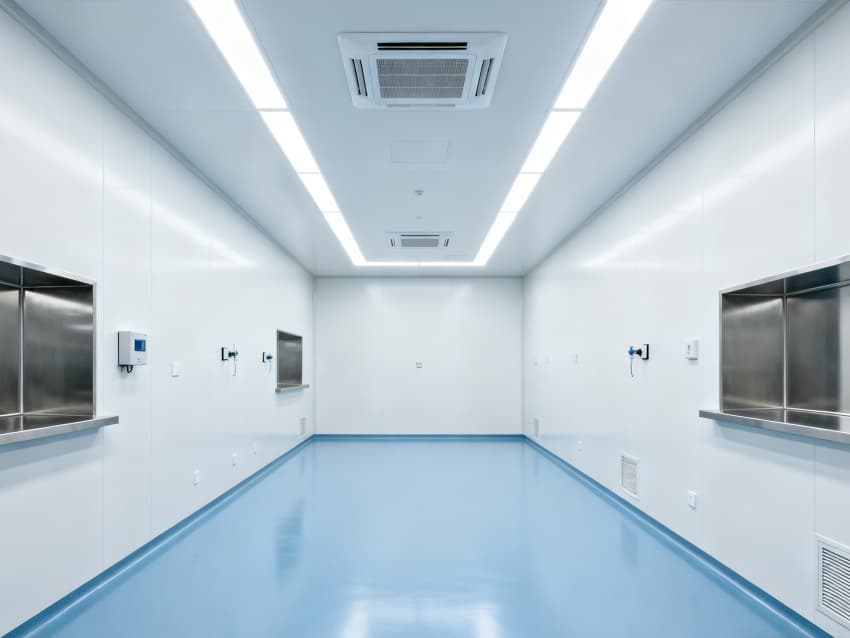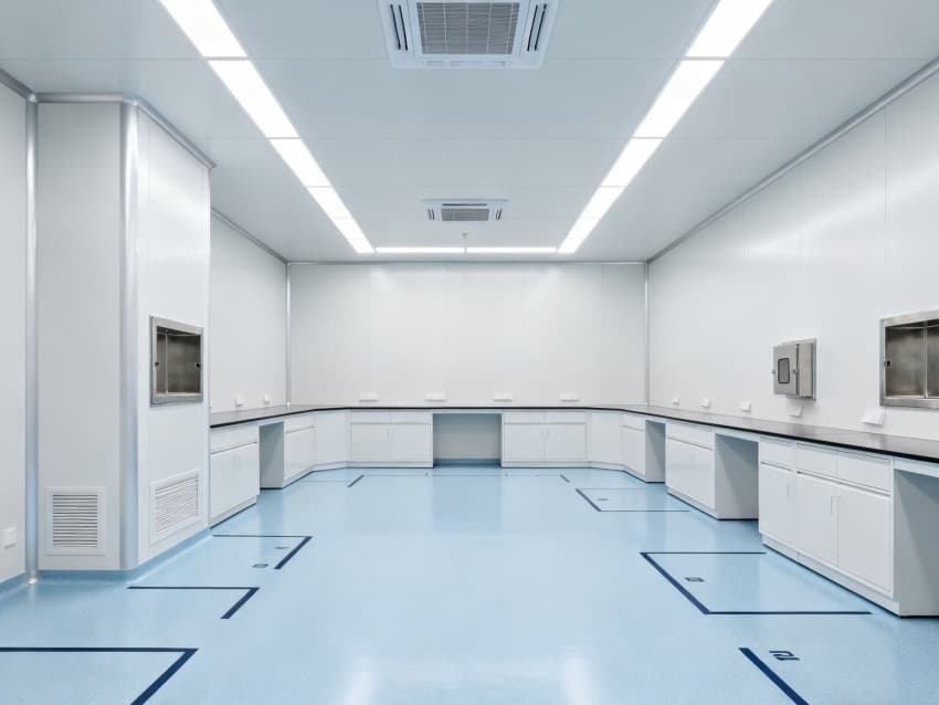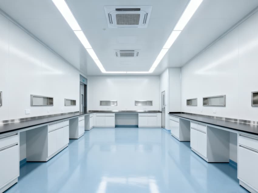 內(nèi)部6個(gè)實(shí)驗(yàn)室均為無設(shè)備空曠布局,按萬級(jí)潔凈標(biāo)準(zhǔn)建設(shè):地面鋪設(shè)無縫抗菌環(huán)氧自流平,墻面采用食品級(jí)不銹鋼潔凈墻板,陰陽角做R40圓弧處理杜絕積塵死角;柱網(wǎng)間距設(shè)為7.5米,預(yù)留實(shí)驗(yàn)臺(tái)、精密檢測(cè)設(shè)備安裝點(diǎn)位及運(yùn)維通道;頂部整合高效新風(fēng)過濾系統(tǒng)、恒溫恒濕裝置與防眩光LED照明,所有管線暗藏于吊頂內(nèi),最大化釋放空間高度與視野;實(shí)驗(yàn)室間通過通透玻璃隔斷銜接,進(jìn)一步強(qiáng)化整體空曠感,為藥物合成、質(zhì)量檢測(cè)等核心研發(fā)環(huán)節(jié)提供安全、潔凈的專屬環(huán)境。