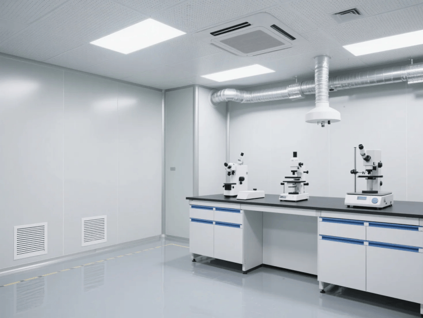 本方案采用高級灰與純白作為主色調(diào),打造嚴(yán)謹(jǐn)專業(yè)的實(shí)驗(yàn)環(huán)境。墻面選用50mm厚聚氨酯保溫彩鋼板,表面覆有抗菌涂層,接縫處采用無縫焊接工藝處理。地面鋪設(shè)2mm厚環(huán)氧自流平地坪,具有優(yōu)異的耐化學(xué)腐蝕性能,灰白相間的分區(qū)標(biāo)識既美觀又實(shí)用。