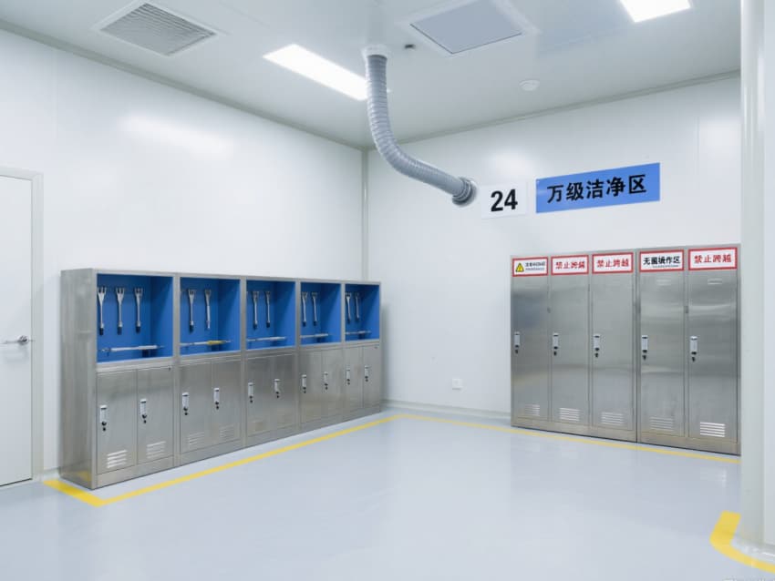 空間內配備不銹鋼潔凈門窗與雙扉傳遞窗,均采用高氣密性密封結構;嵌入式LED潔凈燈提供300-500lux均勻照明,無眩光設計保障操作精度。恒溫恒濕系統精準控制溫度(20-24℃)、濕度(45-60%),藍色功能標識線清晰劃分操作動線,全方位營造安全、穩定的萬級無菌環境。