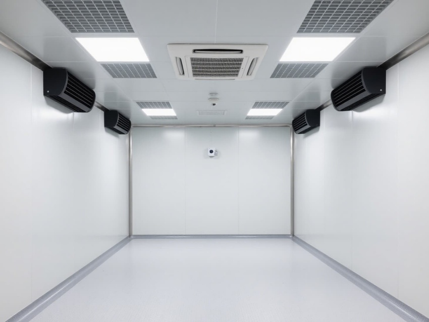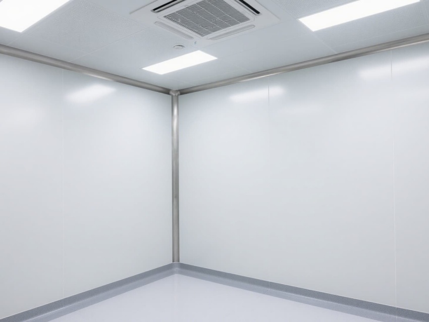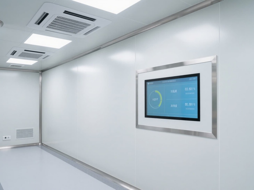 車間以白色抗菌彩鋼板為主體建材,搭配淺灰防靜電地坪,墻面與地面的圓弧過渡設(shè)計消除衛(wèi)生死角,便于徹底清潔消毒。頂部嵌入式高效送風(fēng)口形成垂直層流,配合側(cè)下回風(fēng)系統(tǒng),實現(xiàn)每小時15-25次的空氣置換,持續(xù)維持潔凈正壓。?